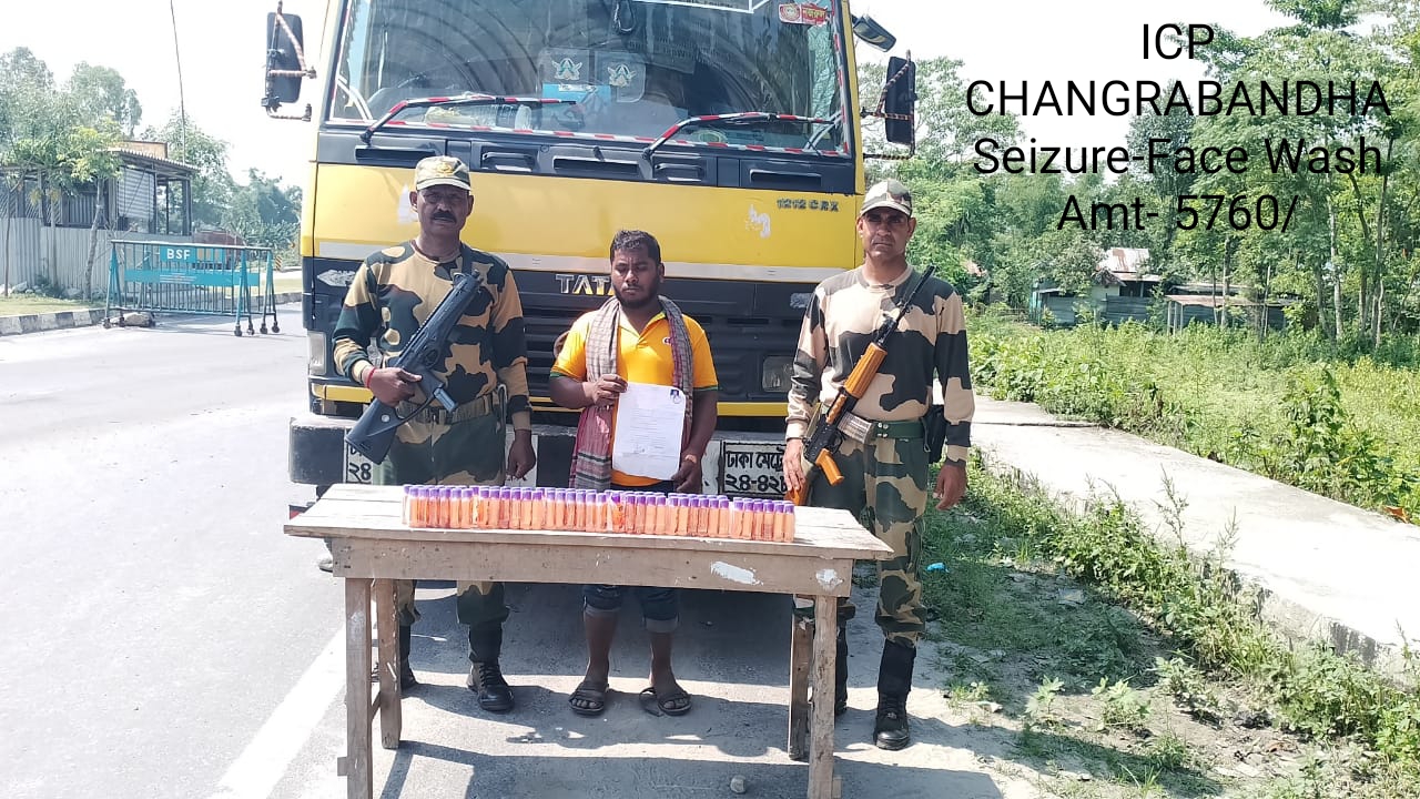 On 09 May 2023 (Tuesday) at about 1100 hrs, acting on a tip-off, alert troops of 151 Battalion BSF under Jalpaiguri Sector in North Bengal Frontier deployed on Indo-Bangladesh border at ICP Changrabandha in Coochbehar district of West Bengal apprehended 01 Bangladeshi truck driver namely Md Sabu (32 yrs), S/o Md Sohider Rahman, R/o Vill-Ufarmara (Burimari), PS-Patgram, Distt-Lalmonirhat (Bangladesh) near ICP Changrabandha along with his truck bearing No.T 24-4286. On thorough checking, a huge number of cosmetic items were recovered which was concealed clandestinely in the cabin of the empty truck which was meant for smuggling from India to Bangladesh. Apprehended Bangladesh truck driver alongwith truck and cosmetic items were handed over to Customs Officials at ICP Changrabandha.